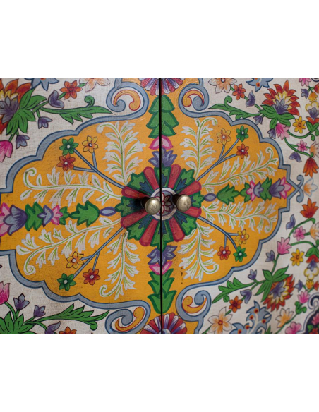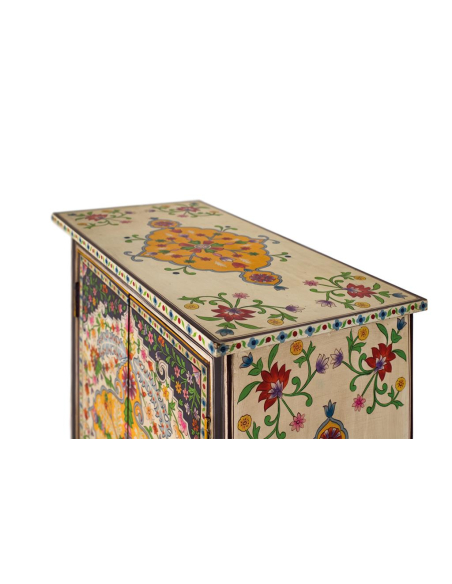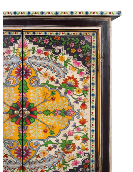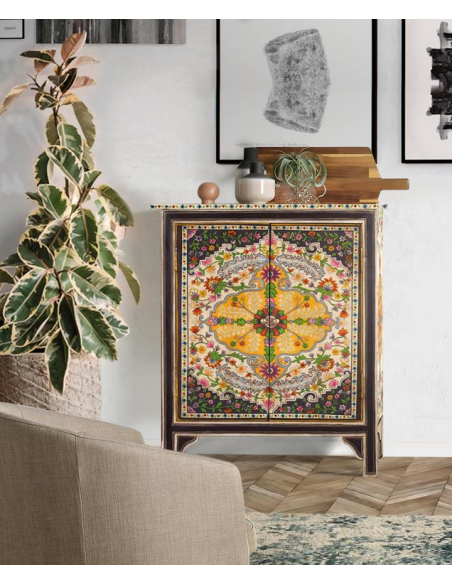 Mueble recibidor pintado a mano, elaborado en madera maciza de mango y MDF, diseñado para aportar funcionalidad y estilo a la entrada de tu hogar. Este elegante mueble cuenta con dos puertas que esconden un práctico estante interno, ideal para organizar y almacenar objetos con facilidad. Toda su superficie está cuidadosamente pintada a mano, con intrincados detalles que convierten cada pieza en una obra de arte única. Los tiradores redondos de metal añaden un toque de sofisticación, mientras que las patas elevadas proporcionan ligereza visual y estabilidad. Perfecto para crear una primera impresión cálida y personalizada en cualquier espacio.