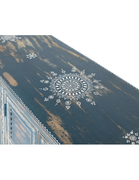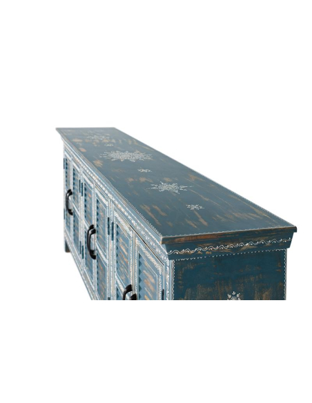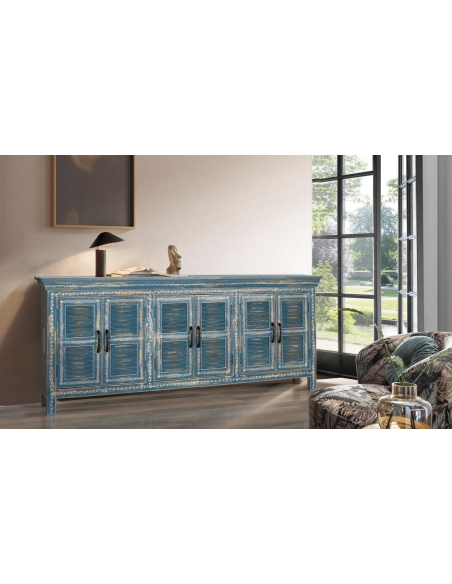 Aparador 6 puertas azul, fabricado en madera de mango, una pieza que combina funcionalidad y diseño artístico. Su estructura incluye estantes internos que ofrecen un amplio espacio de almacenamiento para mantener tus objetos organizados. Pintado en un elegante color azul, cuenta con dibujos hechos a mano en blanco que aportan un toque artesanal y distintivo. Las puertas están decoradas con varillas de madera horizontales que añaden textura y carácter al diseño. Los tiradores de metal verticales y las patas elevadas completan su estética moderna y ligera. Perfecto para ambientes que buscan personalidad y un estilo único.