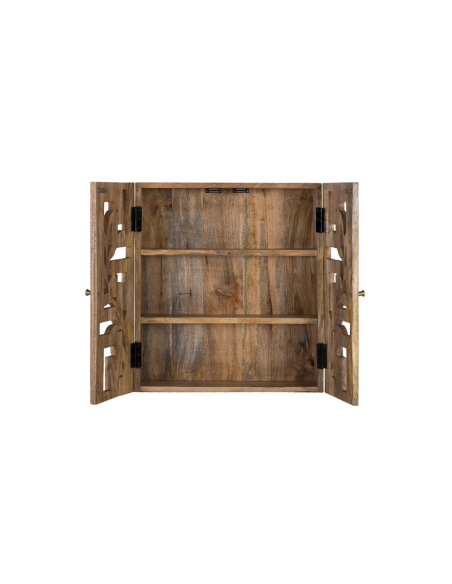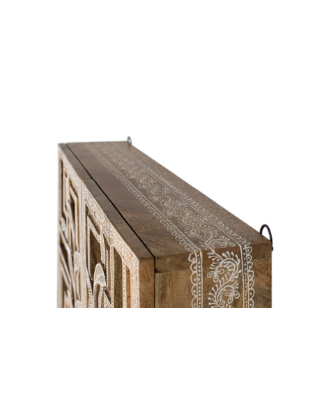 Estantería de pared hojas, perfecta para agregar un toque de calidez y estilo a cualquier espacio. Cuenta con dos puertas en el frente, equipadas con tiradores metálicos que complementan su diseño elegante. En su interior, dispone de estantes para un almacenamiento práctico y organizado. La superficie está adornada con un frente tallado y calado con un diseño de hojas, que no solo embellece la pieza, sino que permite ver parcialmente el interior, creando un efecto visual único. Ideal para complementar salones, dormitorios o pasillos, esta estantería combina funcionalidad con un toque artesanal lleno de encanto.