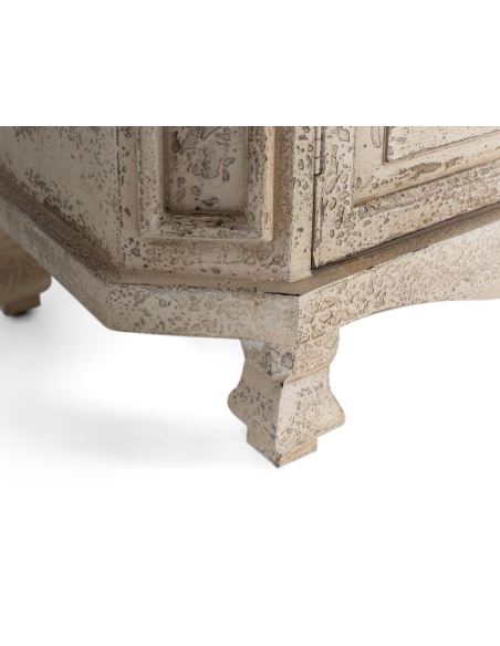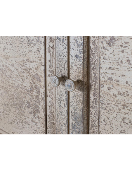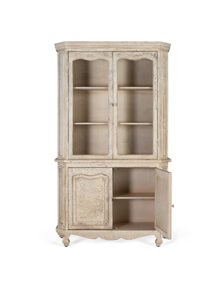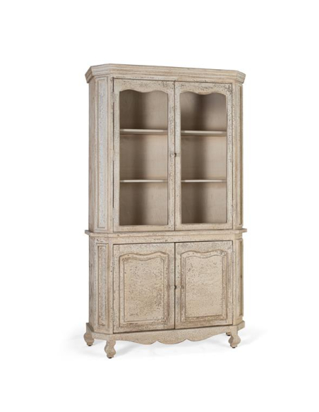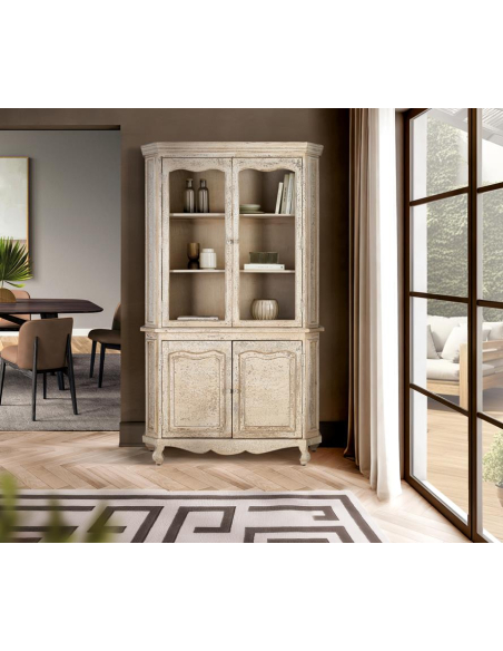 Vitrina rústica blanca, su diseño combina elegancia y funcionalidad, con dos puertas superiores con vidrio ideales para exhibir tus objetos favoritos y dos puertas inferiores cerradas para almacenamiento adicional. Incluye estantes internos que optimizan el espacio. Las patas elevadas le aportan ligereza visual, mientras que las molduras en puertas y laterales añaden un toque de distinción. El fondo en color blanco envejecido contrasta armoniosamente con la madera de mango, destacando su calidez y belleza natural. Perfecta para aportar carácter y estilo rústico a cualquier estancia.