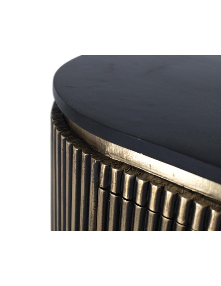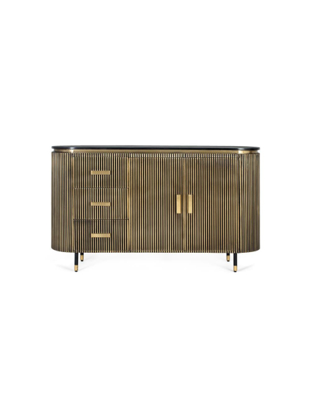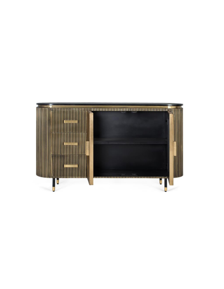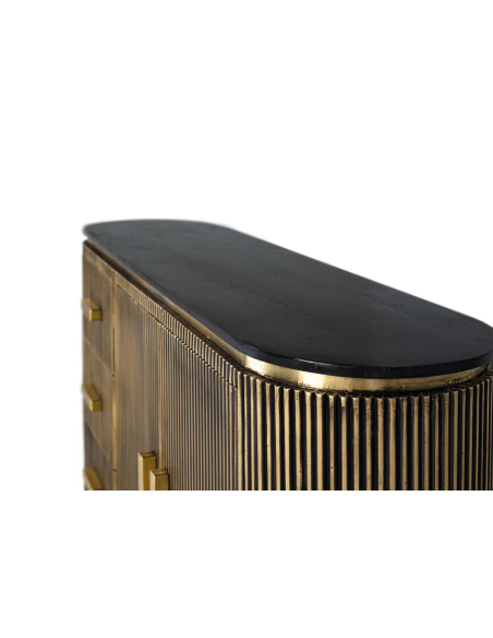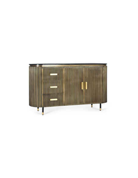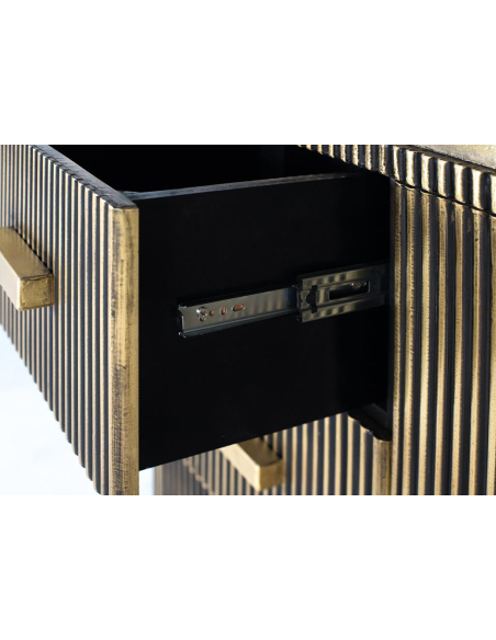 Aparador Zilena bronce, de madera de mango con elegante revestimiento de bronce y diseño moderno. Esta pieza destaca por sus tres cajones y dos puertas, todos revestidos con bronce de acabado único en líneas verticales, que aporta sofisticación y carácter. Los tiradores rectangulares en color bronce complementan a la perfección el diseño. Las patas elevadas negras con detalles en bronce en la base añaden un toque contemporáneo, mientras que la tapa en color negro aporta contraste y estilo. Los cajones cuentan con guías telescópicas metálicas para un deslizamiento suave, y el estante interno detrás de las puertas ofrece espacio adicional de almacenamiento. Un mueble que combina funcionalidad y diseño exclusivo para embellecer cualquier estancia.