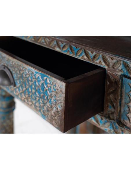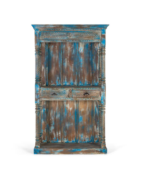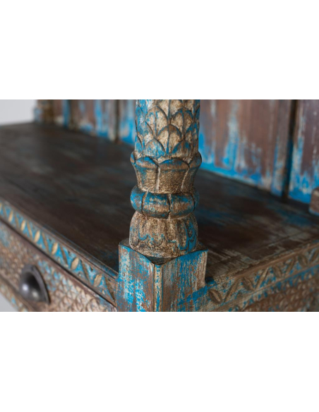 Estantería Erylia azul, de madera de mango estilo étnico con detalles desgastados. Esta pieza única presenta una superficie pintada en tonos azules y blancos con un efecto envejecido que resalta su carácter artesanal. En su diseño, dos cajones en la zona central y uno en la parte superior proporcionan un espacio adicional para almacenamiento. Los tiradores metálicos complementan el estilo rústico, mientras que las columnas talladas en la parte superior e inferior aportan un toque de elegancia. La estantería cuenta con un estante en la base y en el centro, ideal para exhibir objetos decorativos o para almacenamiento adicional.