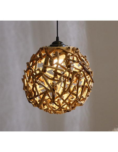Lámpara de techo bola ramas natural 29d cm, transforma la iluminación en una experiencia artística y natural. Su diseño esférico, creado a partir de un entramado de ramas de árbol del té, evoca la forma de un nido, aportando un toque orgánico y acogedor a cualquier espacio. La luz se filtra a través de las ramas, creando un juego de luces y sombras que añade calidez y un ambiente íntimo. Esta lámpara no es solo una fuente de luz, sino también una pieza escultural que atrae la mirada y define el carácter de la habitación.