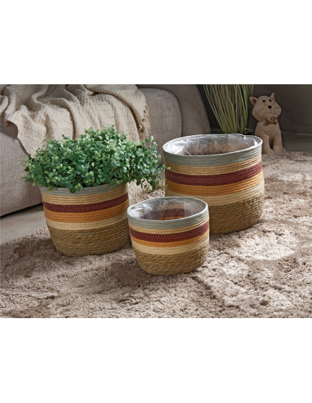 Set 3 maceteros franja tricolor 32d cm, elaborados con fibra natural, presentan un diseño cilíndrico clásico con una franja tricolor que combina tonos cálidos y vibrantes, creando un efecto visual atractivo y lleno de energía. La textura trenzada de la fibra aporta una sensación de calidez y autenticidad, mientras que la combinación de colores añade un toque de originalidad y diversión. El set de tres tamaños diferentes te permite jugar con la composición y crear arreglos vegetales únicos y personalizados. Ideales para plantas de interior, estos maceteros son una forma sencilla y efectiva de inyectar color y alegría a tu decoración, creando un ambiente acogedor y lleno de vida. Su interior forrado con plástico facilita el cuidado de las plantas.