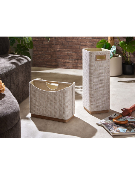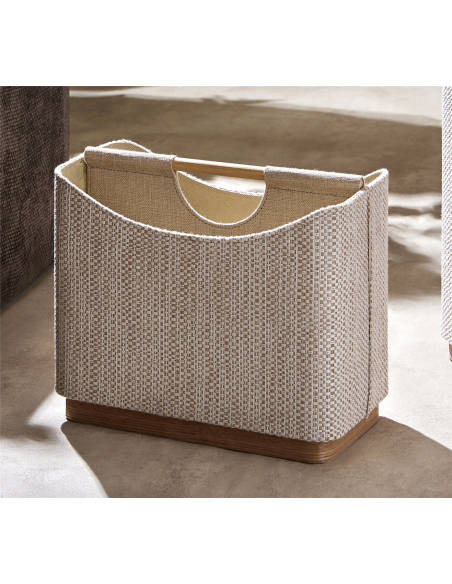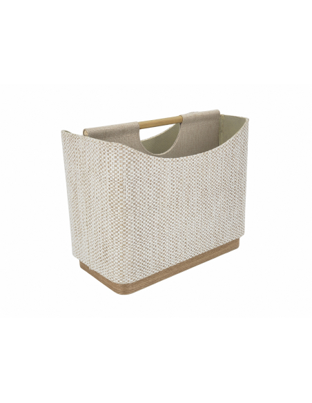 Revistero/organizador pia natural con asa central, una pieza que fusiona la funcionalidad de un revistero con un diseño elegante y acogedor. Este organizador presenta una estructura de madera de abeto, con un asa central que facilita su transporte y le da un toque distintivo. Un lateral está revestido con un tejido, creando un contraste de texturas que aporta calidez y originalidad. Perfecto para mantener tus revistas, libros o periódicos favoritos organizados y al alcance de la mano, este revistero es un complemento ideal para cualquier sala de estar, dormitorio o estudio.