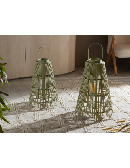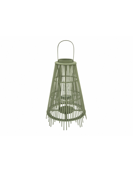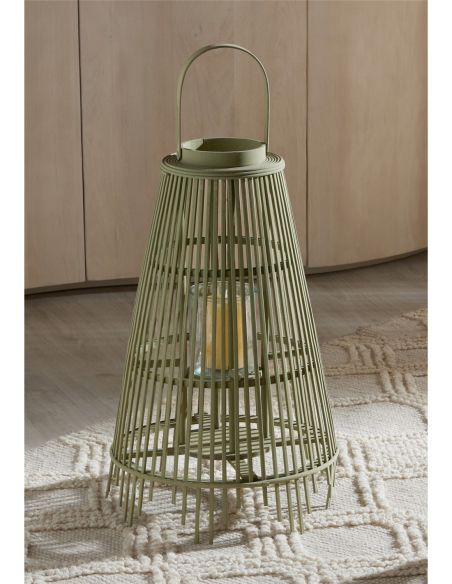 Farol cónico listones verde, ilumina con estilo y un toque de color, perfecto para añadir un ambiente acogedor a cualquier espacio. Su diseño cónico, con listones de madera de paulownia en un vibrante tono verde, crea un juego de luces y sombras que invita a la relajación. El asa superior, además de ser un detalle práctico para transportarlo, le da un toque rústico y encantador. En su interior, un vaso de vidrio protege la vela, garantizando una iluminación segura y duradera. Ya sea en el jardín, la terraza, el balcón o el interior del hogar, este farol es una pieza que aporta calidez, personalidad y un toque de naturaleza a tu decoración.