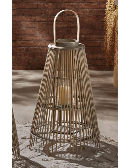 Farol cónico listones gris 59 cm, con un diseño que evoca los faroles tradicionales, esta pieza es ideal para crear un ambiente acogedor. Elaborado con listones de madera, presenta una forma cónica, con un asa que facilita su traslado. Transforma la iluminación en una experiencia artística y natural. La luz se filtra a través de las ramas, creando un juego de luces y sombras que añade calidez y un ambiente íntimo.
