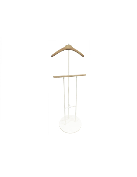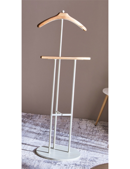 Galán de noche madera/metal blanco 130cm, combina la calidez de la madera con la resistencia del metal, creando un diseño clásico y funcional. Su estructura alta y delgada cuenta con una percha superior para colgar chaquetas o camisas, una barra intermedia para pantalones y una base sólida para zapatos. La combinación de madera y metal en tonos, aportan un toque de elegancia discreta y se adapta a una variedad de estilos de decoración. Perfecto para mantener la ropa organizada y lista para el día siguiente, este galán de noche es un complemento práctico y elegante para cualquier dormitorio.