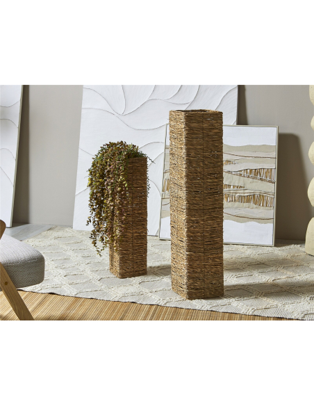 Set 2 maceteros en alto Enea base cuadrada 100 cm, este conjunto de dos maceteros, presentan un diseño funcional, combinando la calidez de la enea con un toque de modernidad, a través de una base cuadrada de metal. Con su forma alargada y elegante, estos maceteros son una pieza ideal para decorar con plantas.