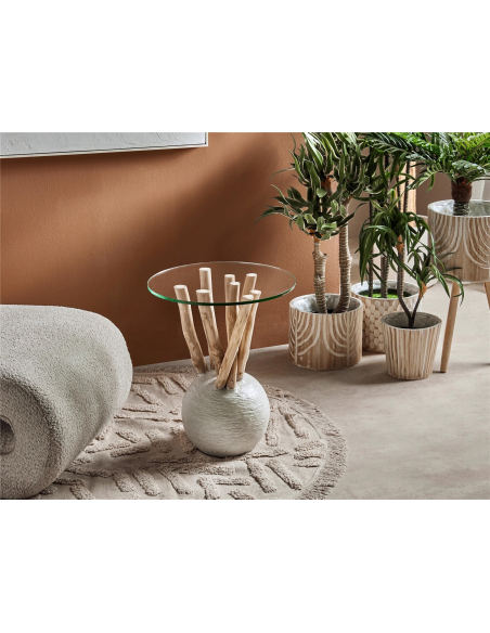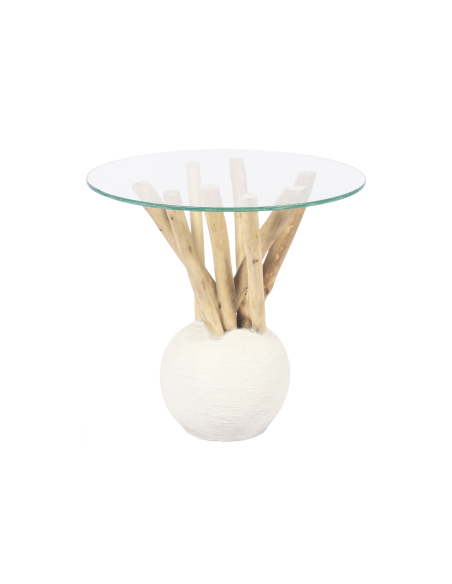 Mesa auxiliar ramas Dolken cristal 40dx48 cm, combinando materiales como la madera, el vidrio y un símil piedra, esta mesa auxiliar, es un elemento original y llamativo, que decora por sí solo cualquier espacio. Su base, con ramas de madera, le da un toque distintivo, mientras que la tapa de vidrio, aporta ligereza visual. Añade personalidad y carácter a cualquier espacio.