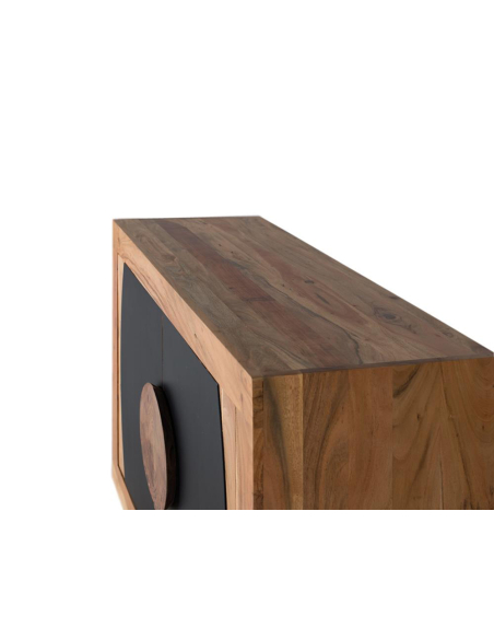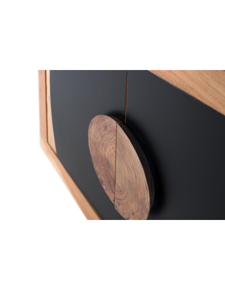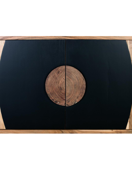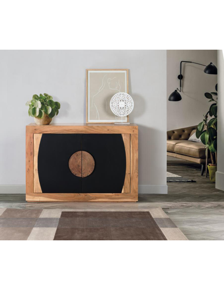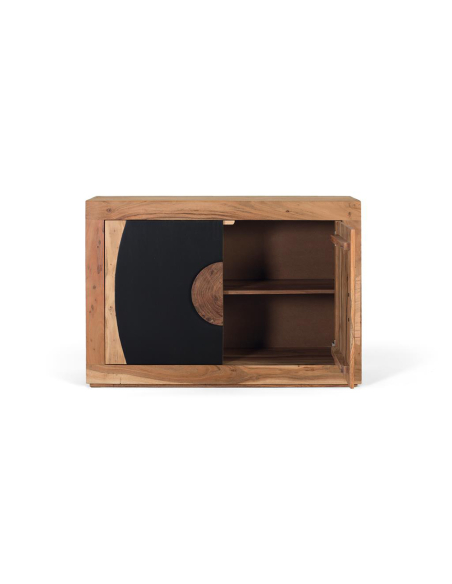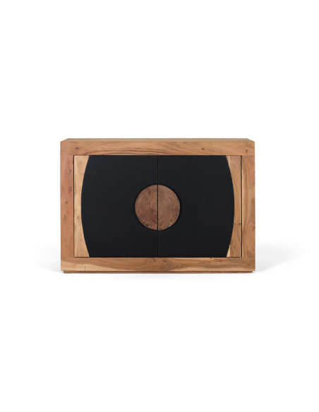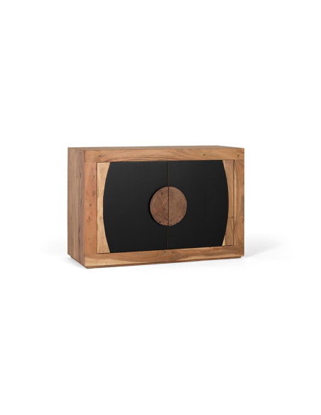 Aparador madera acacia círculo 2 puerta, este mueble combina la robustez y la belleza natural de la madera con un diseño contemporáneo y artístico. Sus dos puertas presentan un llamativo detalle circular central tallado a mano, que actúa como tirador y aporta un elemento distintivo y sofisticado a la pieza. A pesar de su tamaño compacto, este aparador ofrece una funcionalidad práctica para el almacenamiento. Su interior proporciona espacio para organizar objetos decorativos, libros, o cualquier otro elemento que desees tener a mano pero oculto. El diseño de líneas limpias y el contraste entre la calidez de la madera de acacia y el detalle circular crean un mueble versátil que se adapta a diversos estilos de decoración, desde el moderno hasta el ecléctico. Este aparador de madera de acacia es ideal para quienes buscan una pieza de mobiliario con carácter y un toque artístico sin sacrificar la funcionalidad. Su diseño cuidado y la calidad de la madera de acacia aseguran una belleza duradera y atemporal.