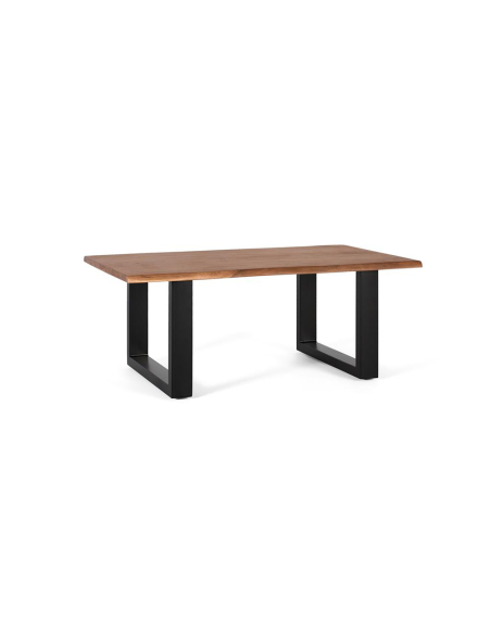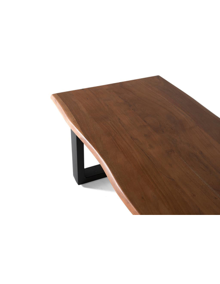 Mesa de centro acacia y metal, destaca por sus bordes irregulares y sus vetas únicas, celebrando la belleza natural de la madera y convirtiendo cada mesa en una pieza única. Las robustas patas de metal en color oscuro proporcionan un contraste industrial y una base sólida para la mesa. Es perfecta para añadir un toque de estilo contemporáneo y natural a tu salón. Su amplia superficie es ideal para colocar libros, revistas, bebidas o elementos decorativos. La combinación de la madera de acacia y el metal crea un equilibrio visual atractivo y versátil que se adapta a una variedad de estilos decorativos. Su diseño robusto, la belleza natural de la madera y el toque industrial del metal la convierten en un mueble imprescindible para tu espacio de estar.