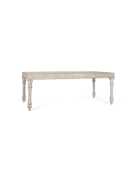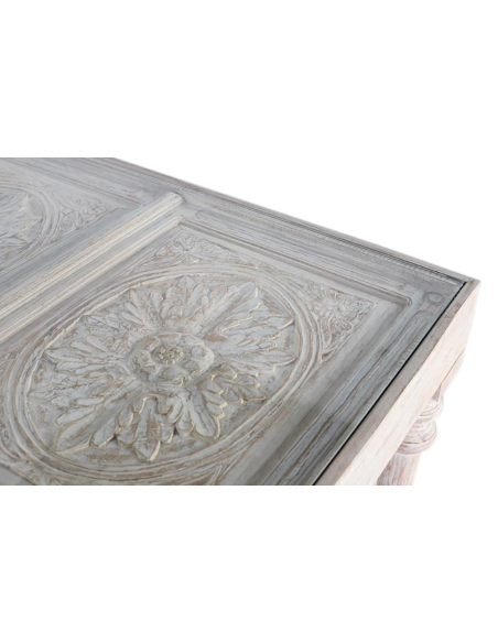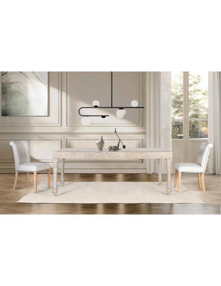 Mesa de comedor blanco decape, fabricada en madera de mango, la tapa rectangular de esta mesa ha sido cuidadosamente trabajada a mano con un delicado diseño, añadiendo un toque de distinción y elegancia. El acabado en blanco decapé, con sutiles desgastes, evoca un estilo shabby chic lleno de encanto. Al igual que el modelo similar, esta mesa cuenta con un cristal de 8 mm transparente que protege la superficie tallada y facilita su limpieza, sin restar protagonismo a la belleza de la madera. Las patas torneadas, talladas con precisión y detalle, añaden un toque de sofisticación al diseño general, reforzando su estética vintage y romántica. Si buscas una mesa de comedor que sea una pieza única y llena de carácter, que combine la belleza de la madera trabajada a mano con un acabado vintage y elegante, esta mesa blanco decapé es la elección perfecta para crear un comedor con un ambiente acogedor y lleno de estilo.