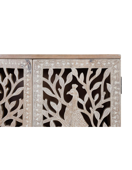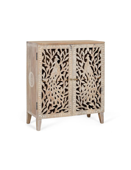 Mueble auxiliar recibidor pavo real, fabricado en madera de mango, este mueble auxiliar ofrece una apariencia sólida y resistente con tonos naturales que evocan calidez. Sus dos puertas talladas a mano muestran intrincados diseños decorativos que aportan textura y un estilo artesanal único, convirtiéndolo en una verdadera obra de arte para tu entrada o cualquier rincón especial de tu hogar. El acabado pintado a mano agrega un toque de color, destacando los relieves de la talla y realzando la belleza de los detalles. En el interior, el mueble cuenta con un estante que divide el espacio, proporcionando almacenamiento práctico y bien organizado para tus llaves, correspondencia u otros objetos esenciales que deseas tener a mano al entrar o salir de casa. Este mueble auxiliar no solo es funcional, sino también una pieza decorativa que refleja tu gusto por los detalles únicos y la artesanía. Su diseño inspirado en la majestuosidad del pavo real aportará un toque de elegancia exótica y personalidad a tu recibidor, creando una primera impresión memorable para tus visitas.
