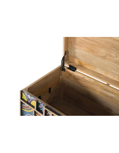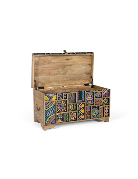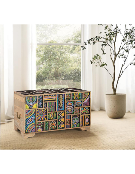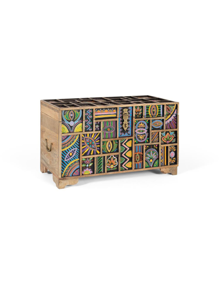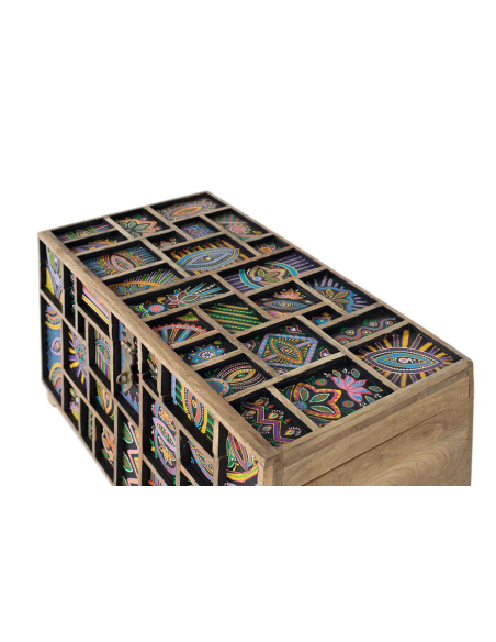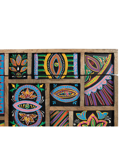 Baúl detalles pintados a mano, fabricada en madera de mango natural, esta cómoda destaca por sus vetas únicas y su diseño artesanal. Sus dos puertas, adornadas con relieves de animales pintados a mano, la convierten en una pieza central llena de carácter y originalidad. Perfecta para el salón o el dormitorio, ofrece un amplio espacio de almacenamiento gracias a su balda interior, manteniendo tus pertenencias organizadas con estilo. Sus cuatro patas sólidas garantizan estabilidad y durabilidad, mientras que el diseño de animales en relieve añade un elemento distintivo y artístico. Cada detalle, desde la selección de la madera de mango hasta la pintura a mano, refleja la alta calidad y el cuidado artesanal de esta cómoda. Ideal para quienes buscan un mueble funcional con un toque único y personal.