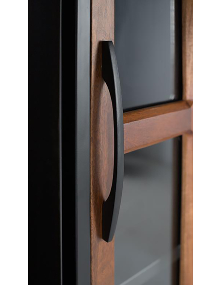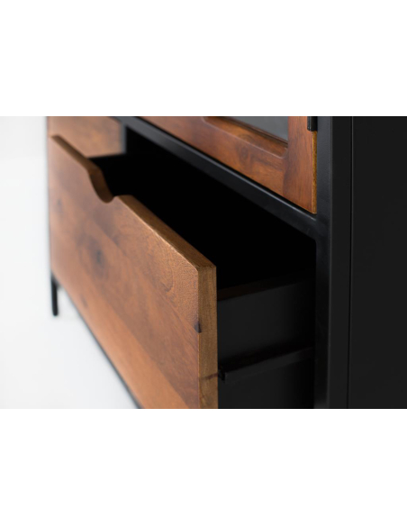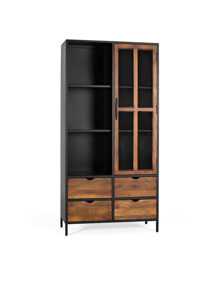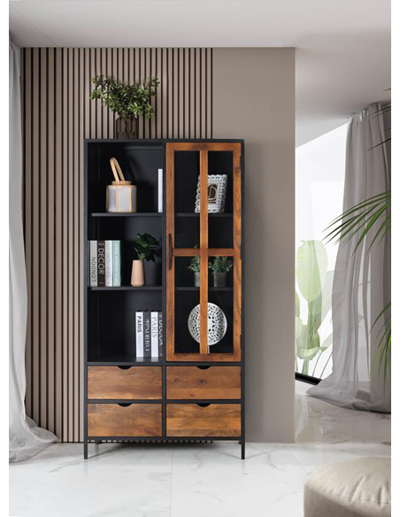 Vitrina industrial Meiji 1 puerta 4 cajones, este mueble combina de forma inteligente zonas de exposición y almacenamiento oculto, manteniendo la coherencia estética de la colección con su estructura de metal negro y detalles en madera de mango. La puerta alta con diseño de puertas con acristalado permite exhibir tus objetos decorativos favoritos o tu cristalería, mientras que la zona de estantes abiertos ofrece un acceso rápido a libros u otros elementos. La funcionalidad es clave en esta vitrina. Además de la zona de exposición tras la puerta y los estantes abiertos, cuenta con cuatro prácticos cajones en la parte inferior, perfectos para guardar objetos más pequeños, cubertería, o aquello que prefieras mantener fuera de la vista pero bien organizado. La combinación de metal y madera de mango garantiza la robustez y durabilidad, mientras que su diseño estilizado la hace ideal para optimizar el espacio sin recargar visualmente. Ideal para salones, comedores o incluso estudios con personalidad, la vitrina Meiji se adapta a ambientes industriales, urbanos o modernos. Ofrece una solución completa que equilibra la necesidad de mostrar y ocultar, aportando orden, estilo y un toque industrial muy actual a tu decoración. Es una pieza funcional y decorativa que no pasará desapercibida.