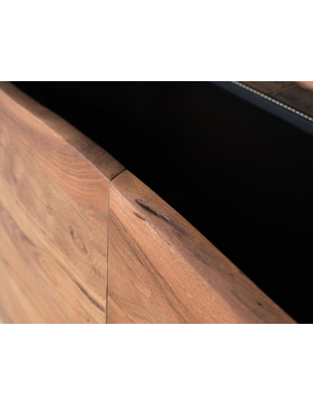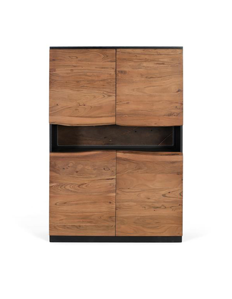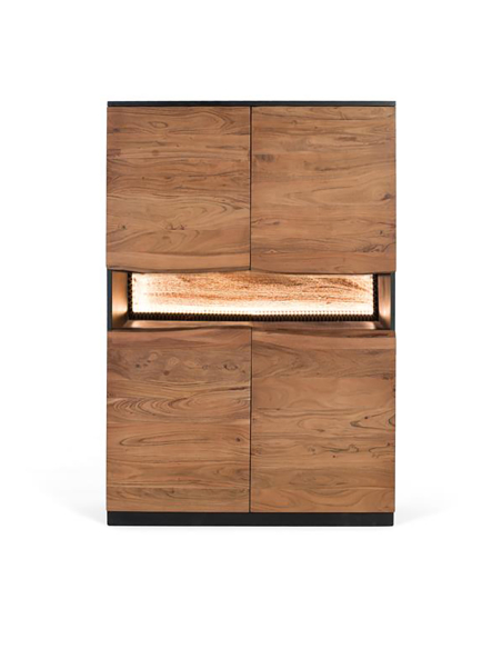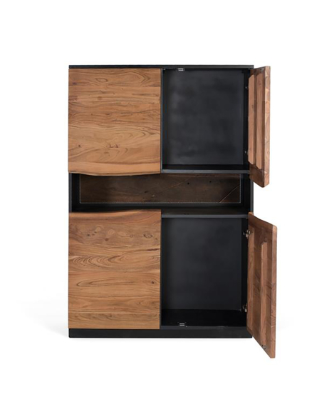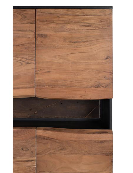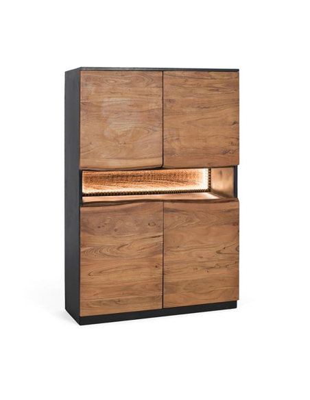 Aparador alto con luz 4 puertas, construido en madera maciza de acacia con un elegante acabado que combina tonos naturales y oscuros, este mueble irradia una sofisticación contemporánea. Sus cuatro puertas, con los característicos frentes de acacia que muestran la belleza única de sus vetas, ocultan un amplio espacio interior para organizar tus pertenencias más preciadas. El diseño se ve realzado por un nicho central abierto, estratégicamente ubicado entre las puertas superiores e inferiores, que cuenta con iluminación LED integrada. Esta característica no solo añade un toque de calidez ambiental y elegancia, sino que también proporciona el escenario perfecto para exhibir tus piezas decorativas favoritas, cristalería o botellas selectas, convirtiéndolas en el centro de atención. Este aparador alto es una solución de almacenamiento vertical ideal para comedores o salones que buscan combinar funcionalidad y un diseño refinado. La madera de acacia asegura que cada pieza sea única, aportando autenticidad y carácter natural.