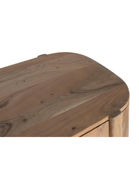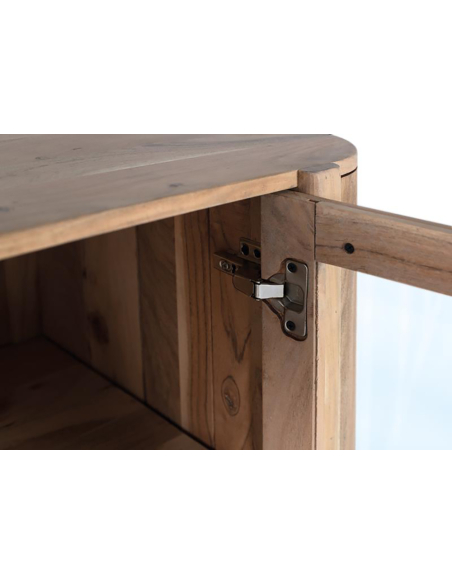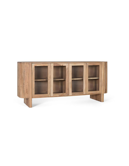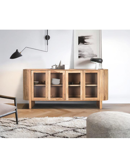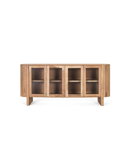 Aparador Hirohito curvo 4 puertas con cristal, esta pieza singular destaca por sus suaves líneas curvas en los laterales y su construcción en madera maciza de acacia con un acabado natural que celebra la belleza de sus vetas. Es un mueble que combina la calidez de la madera con una estética contemporánea y fluida, alejándose de las formas estrictamente rectilíneas. Funcionalidad y estilo se unen en su diseño. Las cuatro puertas con paneles de cristal te permiten exhibir tu vajilla, cristalería u objetos decorativos favoritos, manteniéndolos protegidos del polvo pero a la vista. El interior cuenta con estantes que facilitan la organización. Su distintiva estructura curvada, apoyada sobre una base sólida y de diseño limpio, le confiere una presencia escultural y elegante. Ideal para el comedor o el salón, el aparador Hirohito aporta una solución de almacenamiento generosa sin renunciar a un diseño único. Su acabado en madera natural de acacia y sus formas suaves encajan a la perfección en ambientes contemporáneos, nórdicos, de inspiración japonesa o cualquier espacio que busque un toque de serenidad y originalidad.