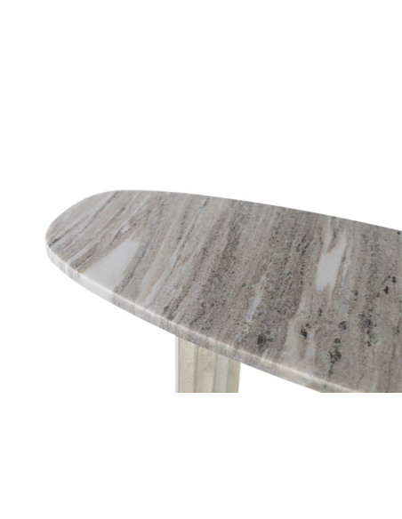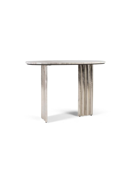 Consola recibidor ovalada mármol, su diseño combina la elegancia clásica de una tapa ovalada de mármol, con la riqueza de sus vetas naturales, y una base de aluminio de carácter moderno y textura singular. Es la pieza perfecta para añadir un toque de sofisticación y funcionalidad a tu entrada o pasillo. La base de la consola es el elemento más llamativo: fabricada en aluminio, presenta una superficie ondulada o estriada con una textura rugosa y un acabado metálico (gris/plateado). Este detalle le confiere un aspecto moderno, casi industrial chic, que contrasta maravillosamente con la superficie lisa y pulida del mármol ovalado, creando un equilibrio visual fascinante y lleno de personalidad. Su forma estilizada y profundidad reducida la hacen ideal para espacios estrechos como recibidores o pasillos, ofreciendo una superficie útil para dejar las llaves, el correo o exhibir elementos decorativos como un jarrón o una lámpara.