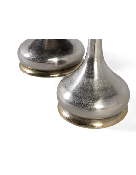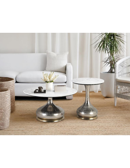 Set de 2 mesas auxiliares aluminio gota tapa mármol, combina la sofisticación de un tablero redondo de mármol blanco veteado con una base escultural de aluminio. El acabado metálico de la base aporta un brillo moderno y refinado. El diseño distintivo de estas mesas reside en su base con forma de gota o ánfora estilizada, que aporta una sensación orgánica y elegante. Las curvas suaves del aluminio pulido contrastan con la solidez del mármol, creando un conjunto armonioso y visualmente atractivo. El set incluye dos mesas de diferentes tamaños, perfectas para usar juntas como mesa de centro alternativa o separadas como puntos de apoyo junto a sofás o sillones. Este set es ideal para quienes buscan piezas auxiliares que sean tanto funcionales como decorativas. Su combinación de mármol y metal pulido encaja perfectamente en interiores modernos, contemporáneos o de estilo glam, añadiendo un toque de brillo, lujo y diseño escultórico a la estancia.