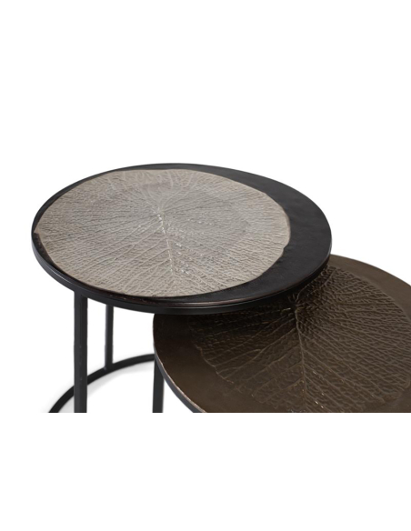 Set de 2 mesas auxiliares textura hojas, presentan una fascinante textura en relieve con motivos de hojas, elaborados en metal con acabados como latón o bronce envejecido. Estos tableros texturizados descansan sobre una estructura metálica minimalista en color negro. El set consta de dos mesas de diferentes alturas, diseñadas para encajar parcialmente una debajo de la otra (tipo nido) o para usarse de forma independiente. La base, de líneas sencillas y forma semicircular o circular completa en la más pequeña, cede todo el protagonismo a los singulares tableros. El contraste entre la textura orgánica y detallada de las hojas y la simplicidad de la estructura negra crea un equilibrio muy actual. Perfectas como mesas de apoyo en el salón, junto a un sofá o butaca, o incluso como mesitas de noche alternativas, este set aporta funcionalidad y un punto focal artístico.