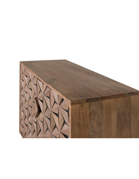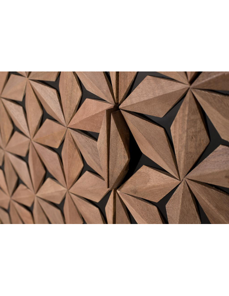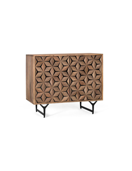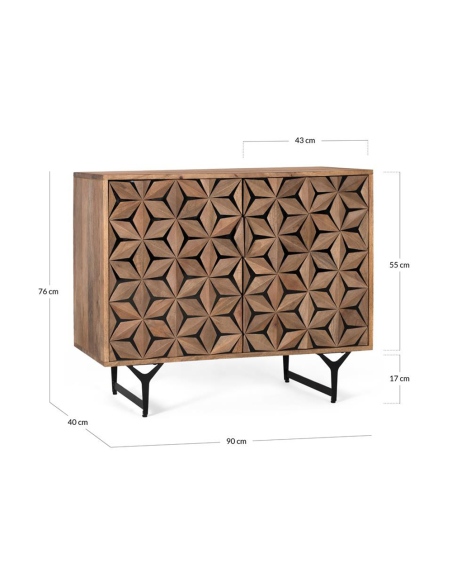 Aparador Akihito madera y negro, fabricado en madera de mango natural, este mueble de dos puertas cautiva todas las miradas gracias al espectacular patrón geométrico tridimensional que adorna sus frentes. Las formas teseladas, que recuerdan a estrellas o flores, crean un juego visual fascinante sobre un fondo negro que realza el relieve. Este aparador no es solo una obra de arte, sino también una solución de almacenamiento funcional. Tras sus dos puertas con el intrincado diseño se esconde un práctico espacio interior para guardar vajilla, mantelería, libros o cualquier objeto que desees mantener organizado. El cuerpo de madera natural descansa sobre unas modernas patas metálicas en color negro, de diseño angular, que aportan ligereza y un toque contemporáneo al conjunto. Ideal para el salón, comedor o incluso un recibidor amplio, el aparador Akihito se convierte en el protagonista indiscutible de la estancia. Su mezcla de madera natural, diseño geométrico audaz y detalles en negro encaja a la perfección en decoraciones modernas, contemporáneas, eclécticas o incluso de inspiración mid-century. Una pieza que combina artesanía, diseño vanguardista y funcionalidad.