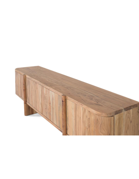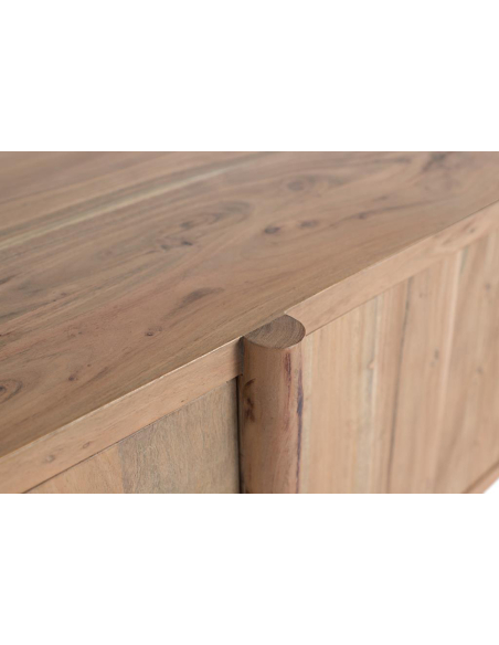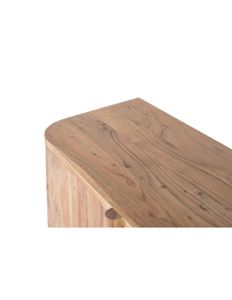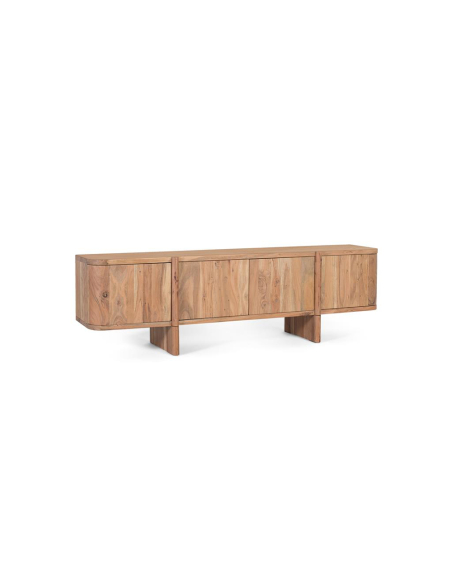 Mueble de tv Hirohito 4 puertas, fabricado en madera de acacia, este mueble bajo destaca por sus suaves líneas curvas en los laterales y la belleza intrínseca de la veta de la madera. Su diseño alargado ofrece una amplia superficie para televisores de gran tamaño y una generosa capacidad de almacenamiento. Funcionalidad y estética se dan la mano en esta pieza. Las cuatro puertas dan acceso a un espacioso interior, ideal para guardar dispositivos electrónicos, consolas, películas, juegos y otros accesorios, manteniendo el espacio ordenado y libre de desorden visual. La estructura, apoyada sobre bases sólidas y de diseño limpio, asegura estabilidad y realza su carácter contemporáneo y natural. Este mueble de TV es la elección perfecta para salones que buscan combinar un diseño fluido y moderno con la calidez de los materiales naturales. Se integra a la perfección en ambientes contemporáneos, nórdicos o de inspiración natural, aportando una solución de almacenamiento estilizada y funcional para tu centro de entretenimiento.