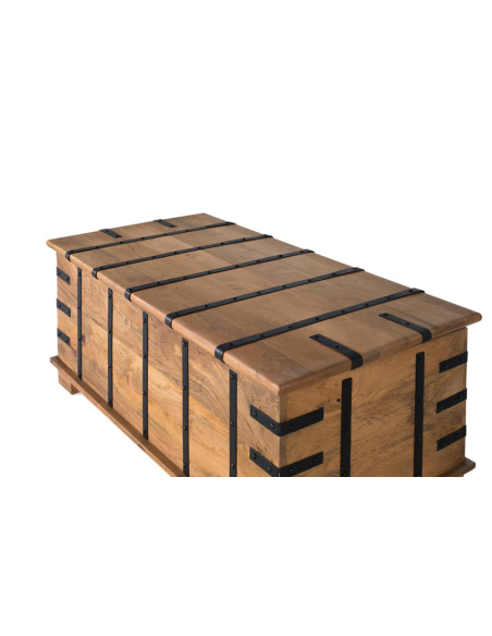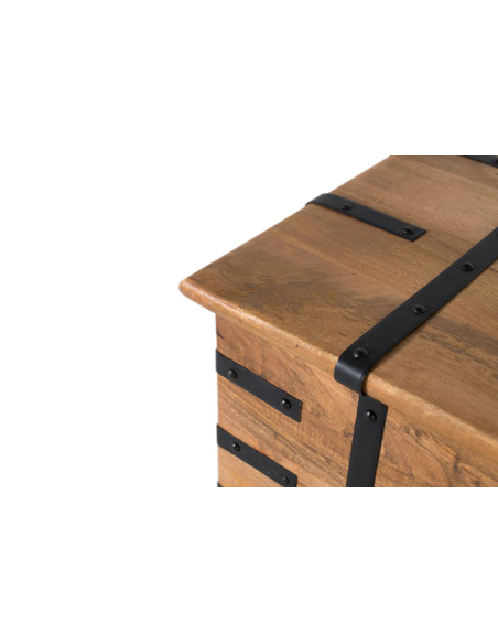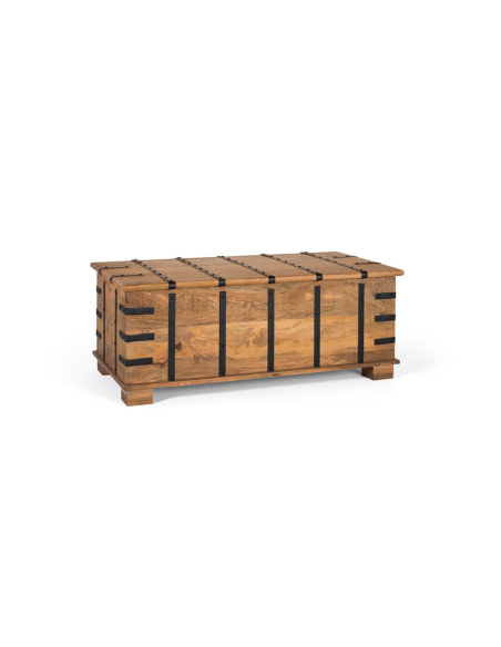Baúl Naruhito rústico, fabricado en madera de mango maciza con un cálido acabado natural que resalta sus vetas, este baúl evoca la estética de los arcones antiguos gracias a sus llamativos herrajes metálicos en color negro, que incluyen bandas decorativas y refuerzos en las esquinas. Este baúl no solo es una pieza decorativa llena de carácter, sino también un mueble muy funcional. Su amplio interior es perfecto para guardar mantas, cojines, juguetes, ropa de temporada o cualquier objeto que necesites mantener ordenado y fuera de la vista. Además, su tapa plana puede servir como superficie de apoyo ocasional o incluso como asiento improvisado. Ideal para colocar a los pies de la cama, en el salón como mesa de centro alternativa, en el recibidor o en una habitación infantil, este baúl de madera y metal se adapta a estilos rústicos, industriales, coloniales o farmhouse. Aporta calidez, personalidad y una gran capacidad de almacenamiento con un diseño atemporal y muy resistente.