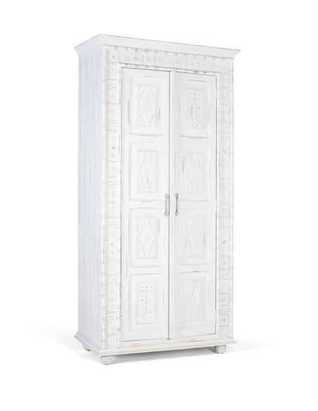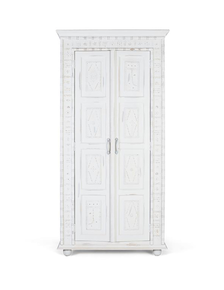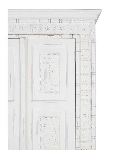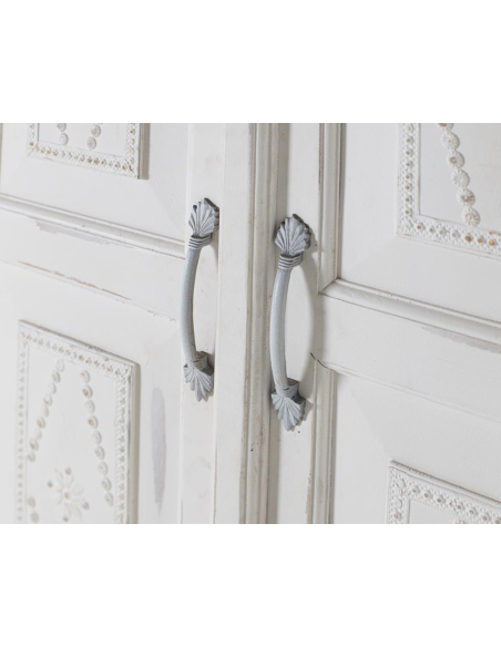 Armario Oriental 2 puertas blanco, fabricado en madera de mango, presenta un delicado acabado en blanco desgastado o decapado que le confiere un aire vintage y luminoso. Su principal atractivo reside en los intrincados detalles tallados o grabados que adornan las puertas y el marco, evocando la artesanía tradicional. Este armario de dos puertas ofrece un práctico espacio de almacenamiento vertical. El interior, probablemente equipado con estantes y/o barra para colgar, te permite organizar tu ropa y accesorios. Los detalles decorativos en relieve, combinados con los tiradores sencillos y el acabado blanco envejecido, crean una pieza elegante y con una personalidad única, que aporta serenidad y estilo. Perfecto para dormitorios de estilo bohemio, shabby chic, romántico o con influencias exóticas, este armario no es solo un mueble funcional, sino también una pieza decorativa que embellece la estancia. Aporta luminosidad, un toque artesanal y una solución de almacenamiento llena de encanto y carácter.
