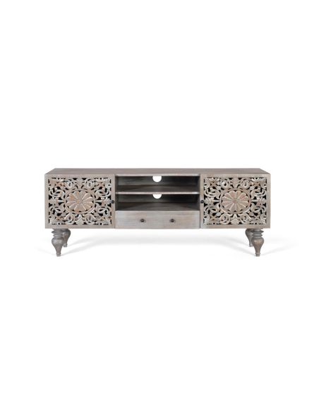 Mueble de TV Tiberio 4 puertas 2 cajones, fabricada en madera de mango maciza con un acabado natural que resalta sus vetas, esta pieza combina puertas cerradas, vitrinas y cajones para satisfacer diversas necesidades de organización, manteniendo la estética rústica y cálida de la colección. Su diseño presenta dos puertas laterales con el característico acabado de lamas o persiana, ideales para guardar objetos que prefieras mantener ocultos. La sección central cuenta con dos puertas acristaladas perfectas para exhibir tu vajilla o elementos decorativos, protegidos pero a la vista. Dos cajones inferiores completan las opciones de almacenamiento, ideales para cubertería o textiles. Los tiradores metálicos negros aportan un contraste moderno. Esta alacena es perfecta para el comedor, salón o incluso una cocina espaciosa, ofreciendo una gran capacidad y adaptándose a estilos rústicos, coloniales o farmhouse. Aporta orden, calidez y la belleza atemporal de la madera maciza a tu decoración, combinando funcionalidad y un diseño robusto.
