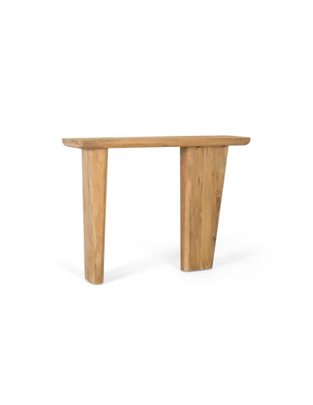 Consola recibidor patas irregulares, su característica más llamativa son sus dos patas de diseño irregular y asimétrico, que le confieren un carácter único y vanguardista. La pieza juega con las formas sólidas y los ángulos inesperados en sus soportes, que contrastan con la sencillez de la estrecha tapa rectangular. Es una consola funcional, perfecta para dejar las llaves, el correo o colocar un pequeño objeto decorativo, pero sobre todo, es una declaración de estilo que no pasará desapercibida. Ideal para recibidores, pasillos o como mueble auxiliar en salones de estilo moderno, contemporáneo o minimalista con gusto por el diseño único. Esta consola combina la calidez de la madera natural con una forma artística y funcional.
