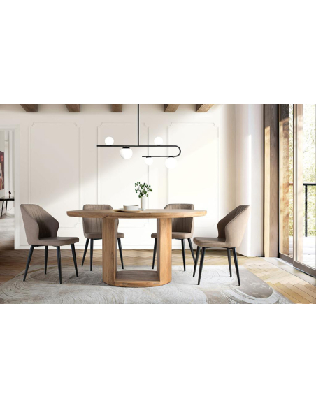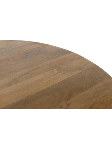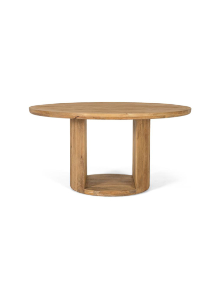 Mesa de comedor redonda abertura central, con un cálido acabado natural, destaca por su gruesa tapa redonda y su singular base de pedestal central. Es una pieza que combina solidez con un diseño contemporáneo y acogedor. La base es el elemento distintivo: está formada por dos sólidos soportes semicilíndricos o pilares de madera que dejan una abertura central, todo ello descansando sobre una base redonda tipo zócalo. Este diseño no solo garantiza una excelente estabilidad, sino que aporta un toque arquitectónico y moderno a la mesa. Perfecta para comedores que buscan fomentar la conversación y crear un ambiente íntimo, esta mesa redonda es ideal para estilos contemporáneos, modernos o rústicos actualizados. Su diseño robusto y la belleza natural de la madera de mango la convierten en una pieza central duradera y llena de carácter.