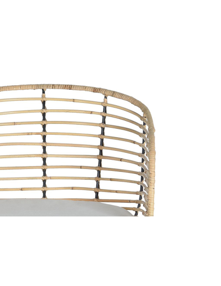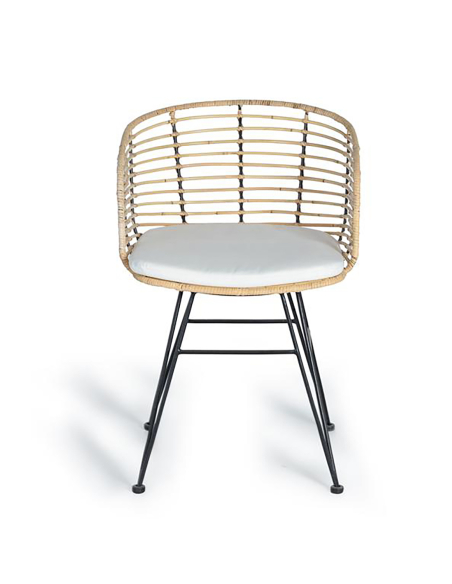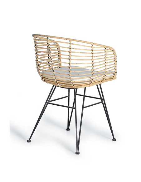 Set 2 sillas ratán y metal apoyabrazos, combina un asiento envolvente con apoyabrazos, tejido artesanalmente en ratán natural, con una estructura ligera pero resistente de patas metálicas en color negro. Incluyen un cojín blanco para mayor comodidad. El diseño logra un equilibrio perfecto entre la calidez y textura orgánica del ratán y la modernidad minimalista de las patas metálicas. Los apoyabrazos y la forma acogedora del asiento aseguran una sentada confortable, ideal para largas sobremesas o como sillas de acento en cualquier rincón. Este set de dos sillas es perfecto para crear un ambiente relajado y estiloso. Se adaptan maravillosamente a decoraciones de estilo nórdico, bohemio, contemporáneo o costero, aportando ligereza visual, confort y un toque natural muy actual.