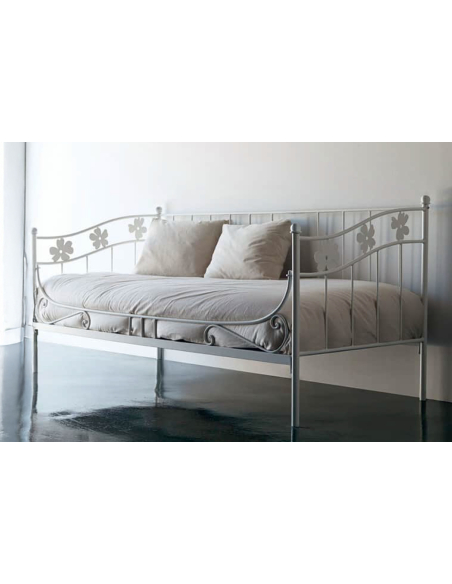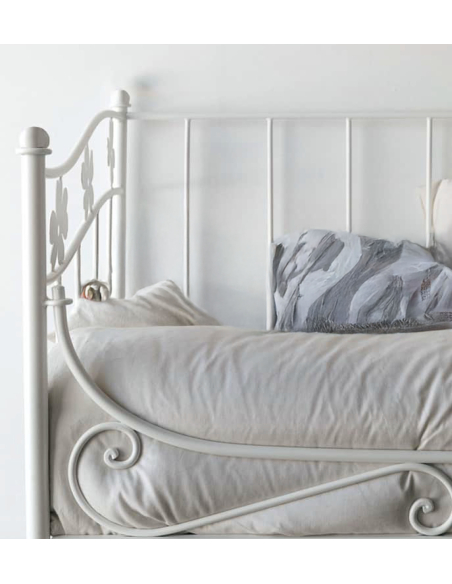 Diván de forja Lino para colchón de 90x190 cm, un mueble multifuncional con un diseño que celebra la simplicidad y la elegancia. Este diván destaca por sus líneas limpias y su estructura minimalista, que le otorgan una apariencia ligera y contemporánea. Los detalles florales en los costados, añaden un toque distintivo y moderno. La forja, con su acabado, aporta una sensación de calidez y autenticidad, mientras que su diseño versátil permite que se adapte a diferentes estilos de decoración. Ya sea como un sofá en la sala de estar o como una cama adicional en una habitación de invitados, este diván combina comodidad y estilo de manera impecable.
