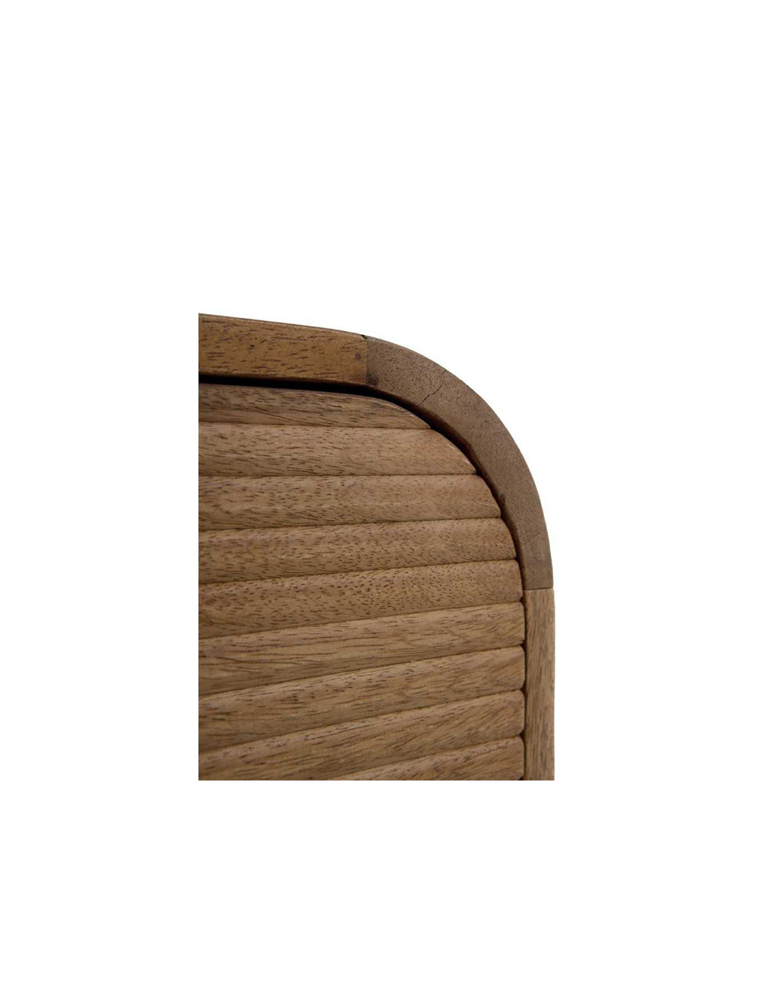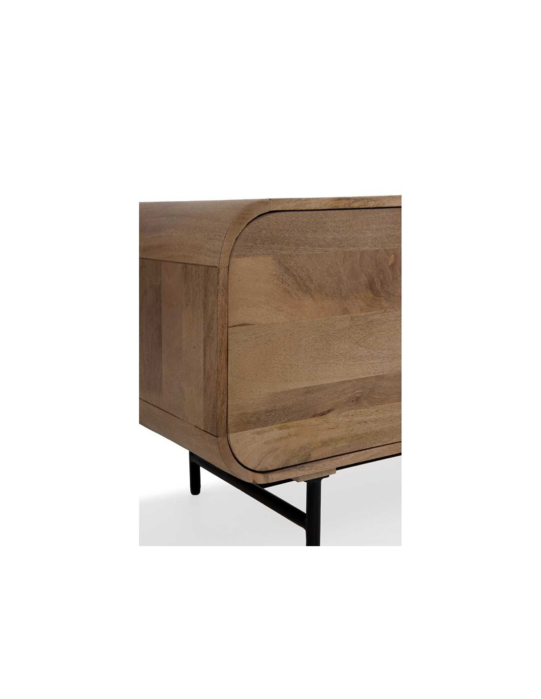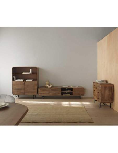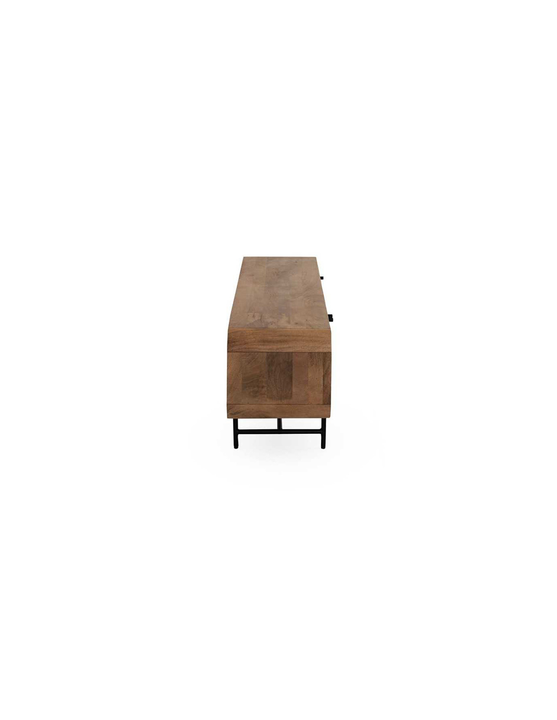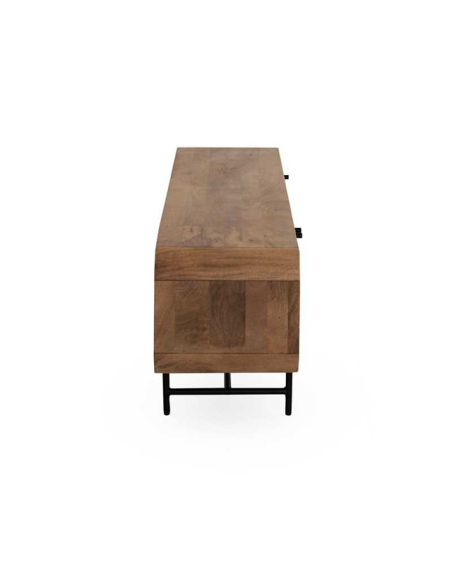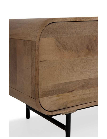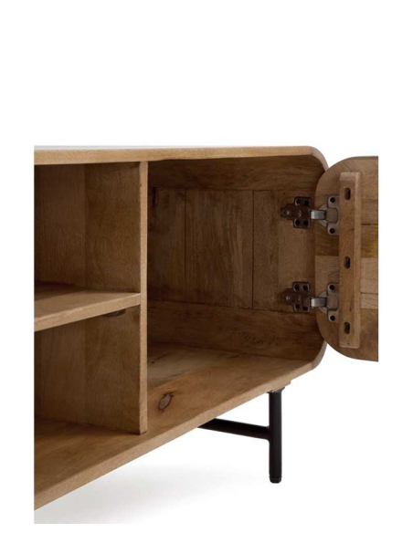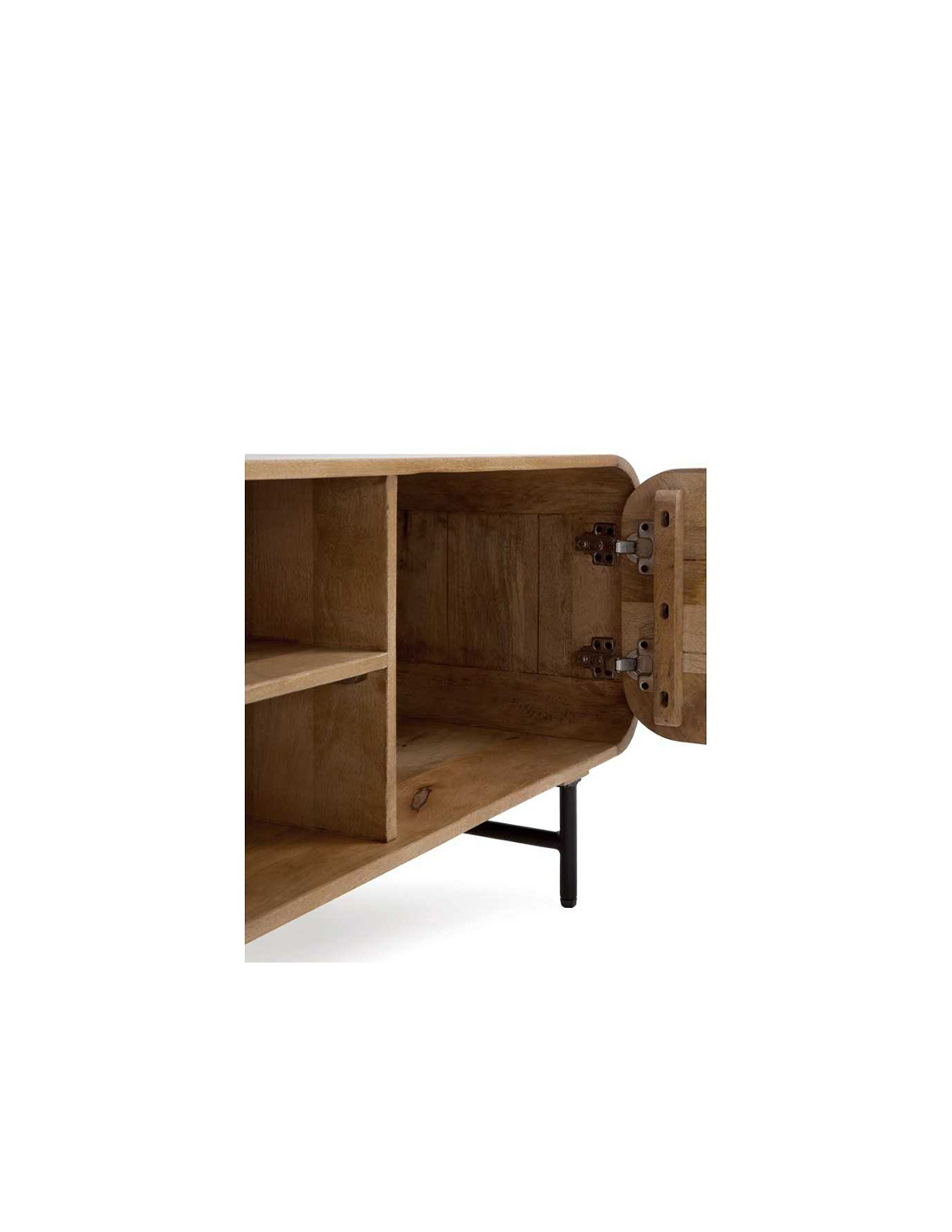 Mueble de TV Ágata 3 puertas, una pieza que combina la nobleza de la madera maciza de mango con la modernidad de las patas metálicas negras. Su diseño rectangular con esquinas redondeadas aporta elegancia y suavidad al ambiente, mientras que los tiradores metálicos cilíndricos en color negro realzan su estética contemporánea. Equipado con bisagras de cierre suave, sus puertas ofrecen un manejo silencioso y cómodo, permitiéndote mantener un espacio ordenado y funcional. Sin baldas internas, este mueble ofrece un diseño limpio y versátil, ideal para televisores, dispositivos multimedia y elementos decorativos, convirtiéndose en un complemento sofisticado y práctico para tu sala de estar. Dispone de agujeros para el paso de cables en parte trasera.