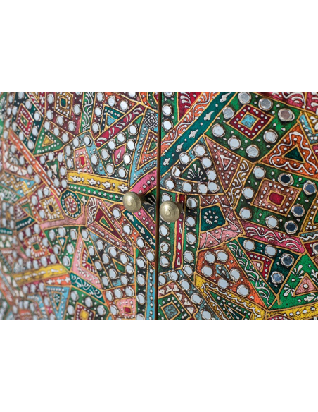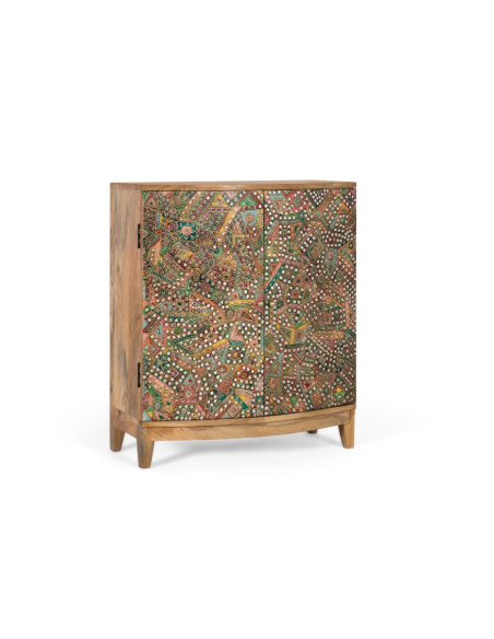 Mueble recibidor Presto colores, es una pieza artesanal en madera maciza con acabado natural que deja ver la veta y aporta calidez al hogar. El frente está pintado a mano con un mosaico multicolor y pequeñas incrustaciones que reflejan la luz, creando un efecto boho-étnico muy decorativo. Dispone de dos puertas con tiradores metálicos y una balda interior fija que genera dos niveles de almacenaje para vajilla, libros o textiles. Las patas cónicas elevadas estilizan el mueble y facilitan la limpieza. Perfecto como mueble de entrada, aparador compacto para salón o dormitorio, combina con fibras naturales y metales envejecidos. Mantenimiento sencillo: paño suave y seco, evitar abrasivos y la exposición directa al sol. No requiere montaje, llega listo para colocar y disfrutar.