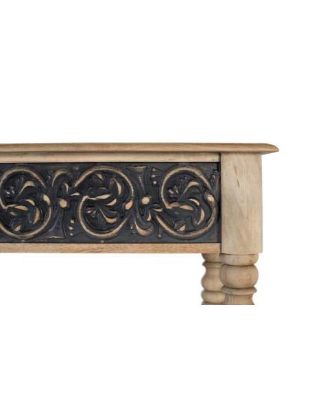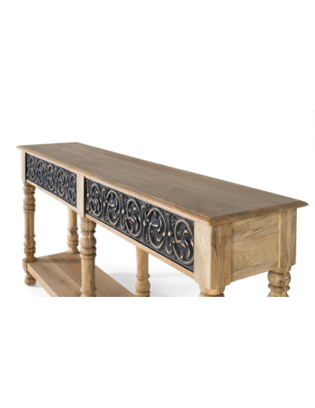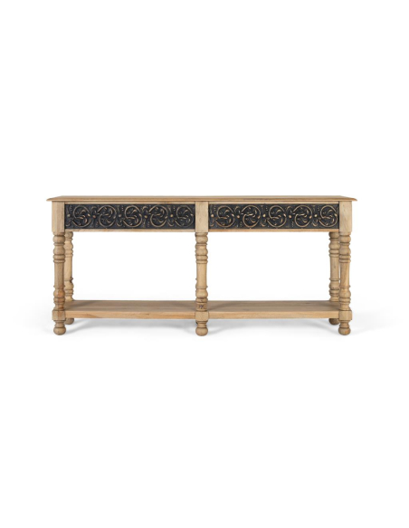 Consola recibidor Andante 2 cajones, está elaborada en madera maciza de mango con acabado natural y un friso frontal de talla artesanal en gris pátina que aporta profundidad y carácter. Su formato estrecho y alargado es perfecto para pasillos y entradas; cuenta con 2 cajones de apertura suave para guardar llaves, correspondencia o cargadores, y una balda inferior corrida que multiplica el espacio para cestas, libros o decoración. Las patas torneadas le dan un aire clásico actualizado que combina con estilos rústico-chic, boho o mediterráneo. Pieza sólida y duradera, cada unidad presenta vetas únicas propias de la madera. Mantenimiento fácil: limpiar con paño suave y seco y evitar productos abrasivos o la exposición directa y prolongada al sol y la humedad.