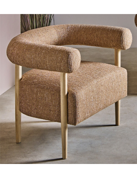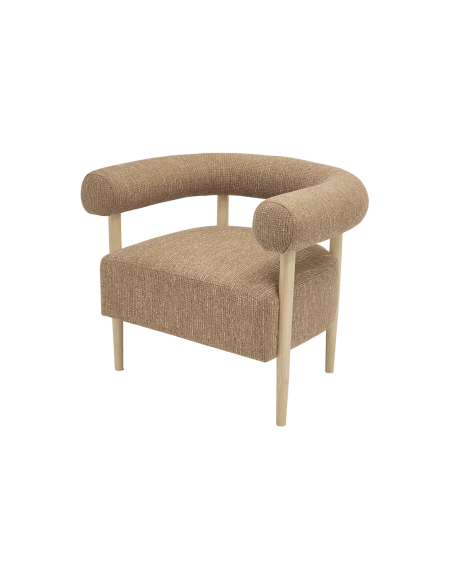 Sillón Mere class tapizada caramelo, reinterpreta la butaca moderna con un respaldo-brazos continuo en forma de arco que abraza el asiento sin recargar el espacio. El tejido en caramelo aporta luminosidad y un grano sutil que viste con discreción, perfecto para salones serenos, dormitorios y zonas de lectura donde se busca confort y ligereza visual.Su base en madera de abedul y patas de hevea proporcionan estabilidad y calidez, mientras el acolchado de espuma y poliéster ofrece un apoyo cómodo para largas conversaciones. Mere funciona muy bien como sillón de acento junto a una mesa auxiliar redonda o en pareja frente a una mesa de centro, marcando un estilo nórdico-japandi elegante y atemporal.