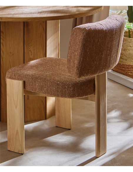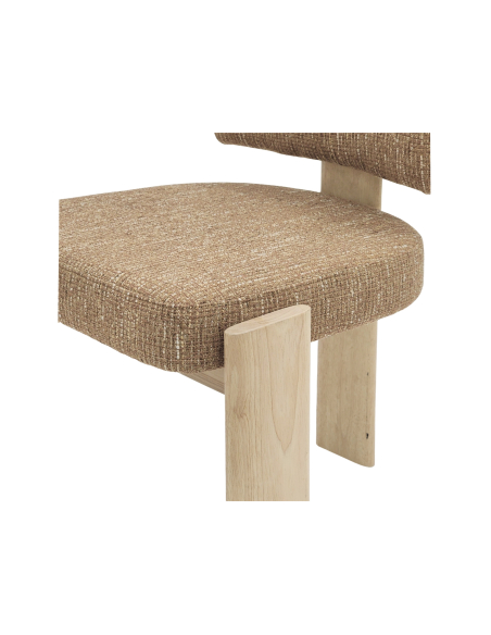 Silla de comedor Ari class caramelo, redefine el comedor con un diseño geométrico y rotundo: patas macizas en madera de hevea de sección rectangular y un asiento amplio que gana presencia sin perder ligereza visual. El respaldo mullido, ligeramente separado del asiento, recoge la zona lumbar y ofrece confort prolongado en comidas y sobremesas. El tejido en caramelo ilumina la mesa y se integra con facilidad en estilos nórdicos o japandi, combinando especialmente bien con tableros de roble, cerámica artesanal y lámparas colgantes de líneas suaves. Su estructura en madera de abedul y el acolchado en espuma y poliéster completan una silla equilibrada entre diseño, comodidad y durabilidad.