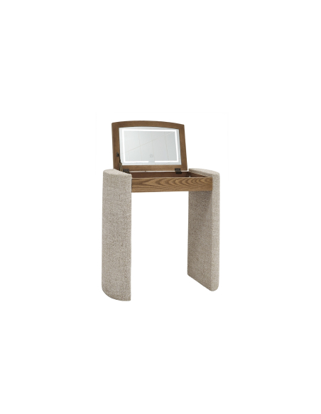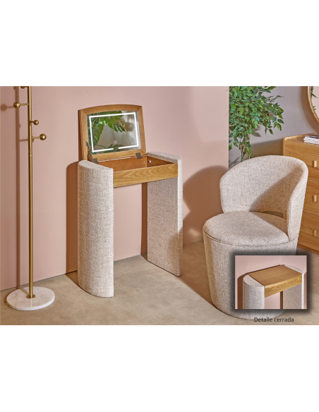 Tocador espejo led patas tapizadas class beige, compacto con tapa abatible que integra espejo con iluminación LED (22 lúmenes, transformador 5V), perfecto para maquillaje y rutinas de cuidado. Las patas tapizadas en tejido beige aportan un gesto decorativo suave y actual, mientras el interior ofrece un hueco organizado de 45×30×8 cm para guardar cosméticos y accesorios. Su formato estrecho permite colocarlo en dormitorios, vestidores o incluso en la zona de baño si cuentas con un rincón libre. La combinación de tapa de madera y tapicería lo convierte en una pieza ligera que suma calidez sin recargar, ideal para proyectos nórdicos o mediterráneos.