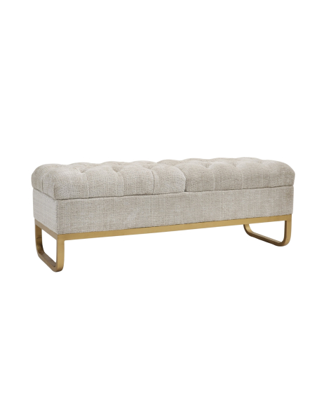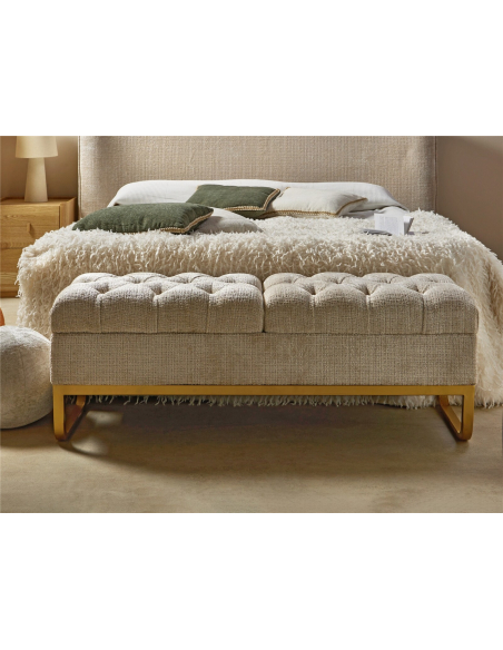 Descalzadora capitoné tapizada dux, suma un grano textil más marcado que realza el capitoné del asiento. Mantiene la misma estructura: 120 cm de ancho, base metálica vista y doble hueco interior (56×37×11 cm) para tener a mano mantas, libros o la ropa de cama de temporada. Diseñada para completar el dormitorio con estilo hotel, también funciona en el recibidor como banco para calzarte y dejar bolsos. Un básico elegante que potencia la sensación de orden y añade un punto de distinción a la estancia.