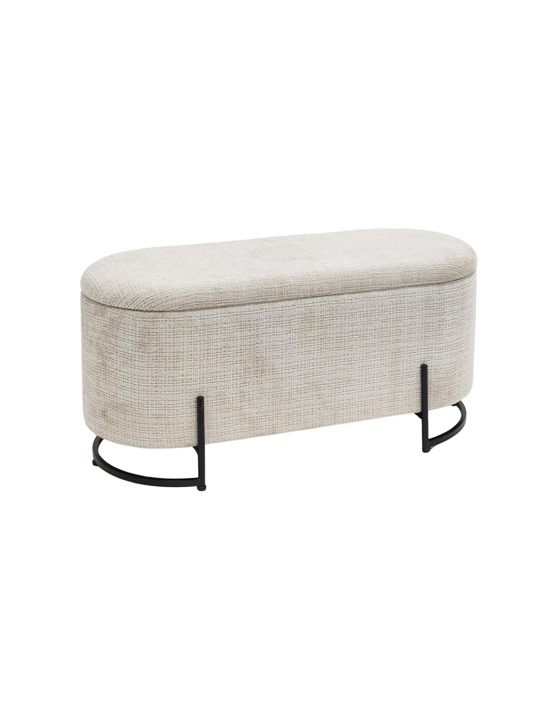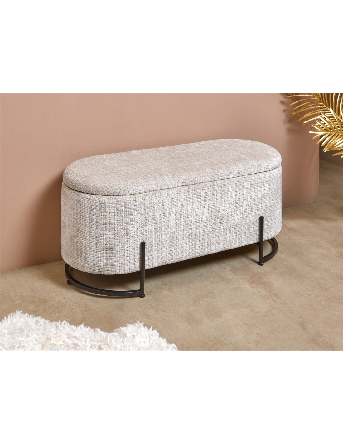 Descalzadora tapizada dux con patas metal con almacenaje, tapizada en un tono neutro que se adapta con facilidad a cualquier estilo decorativo, ofrece un asiento cómodo y un diseño depurado. Su estructura combina madera y poliéster, mientras que las patas metálicas aportan ligereza visual y resistencia. La tapa extraíble permite acceder a un práctico espacio de almacenaje, ideal para tener a mano ropa de cama, revistas o accesorios, logrando un mueble multifuncional que optimiza el orden sin renunciar a la estética. Puede colocarse al pie de la cama como banco auxiliar, junto a una ventana como asiento de lectura o en un recibidor para quitarse los zapatos. Su formato compacto encaja en espacios reducidos, lo que la convierte en una opción inteligente para optimizar el espacio con elegancia.