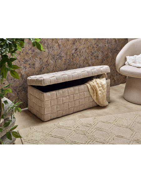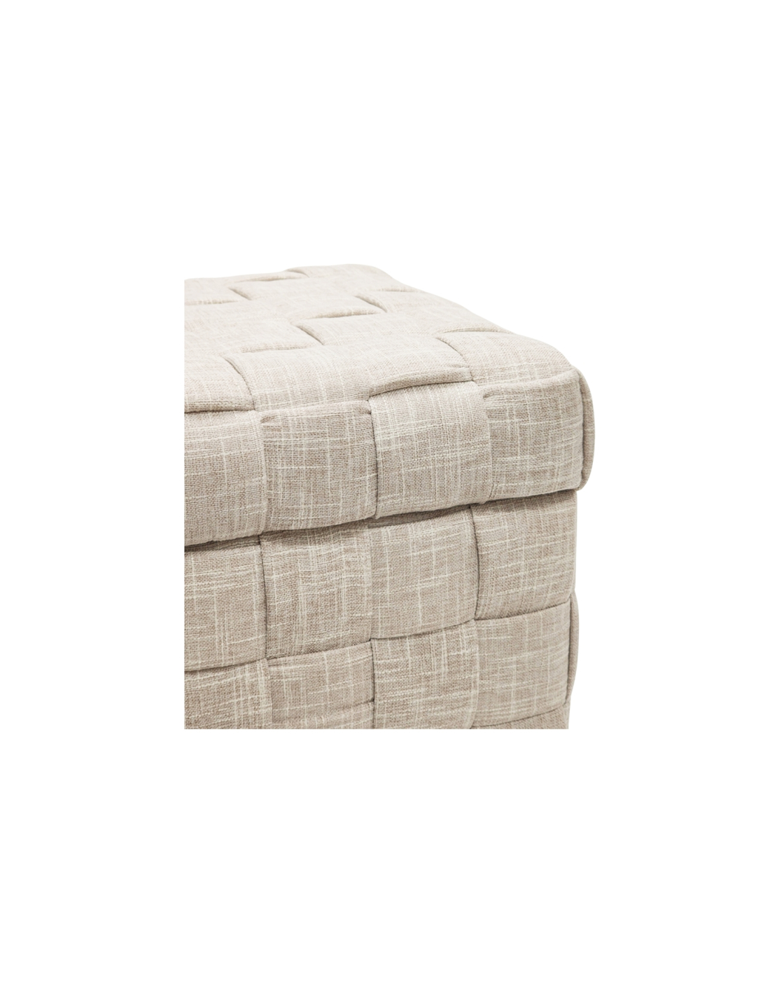 Descalzadora entrelazados beige con almacenaje, elegancia textil y funcionalidad se dan cita en esta descalzadora con diseño en tono beige. Su tapizado trabajado en relieve aporta textura y carácter, convirtiéndola en un elemento que viste el dormitorio o el salón con un estilo acogedor y atemporal. Bajo la tapa abatible se encuentra un espacio de almacenaje ideal para mantener ordenados cojines, mantas o calzado, aportando practicidad al día a día. Su estructura de madera y poliéster asegura confort y durabilidad, mientras su formato compacto permite integrarla fácilmente en diferentes estancias. Esta pieza no solo organiza, sino que también decora: su acabado trenzado la convierte en un mueble con personalidad que enriquece cualquier rincón. Puede usarse también como asiento de apoyo en pasillos o como banco en un vestidor, sumando utilidad sin perder estilo.