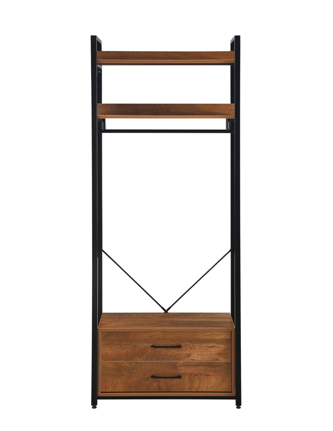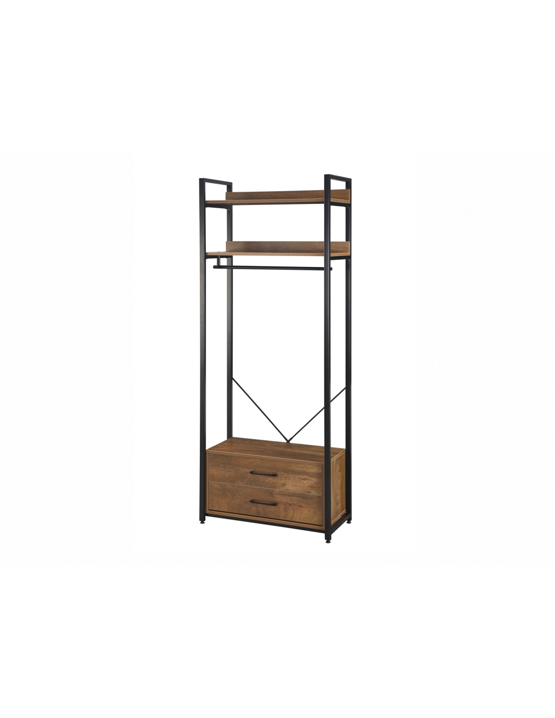 Estantería Perchero Nicodemus cajones y barra de colgar de 200 cm, de estilo industrial con estructura metálica negra y estantes en melamina de acabado madera, perfecta para combinar almacenamiento y decoración. Con una altura de 200 cm, incluye varios estantes abiertos y dos cajones inferiores que permiten mantener el orden en cualquier estancia. Su diseño versátil la hace ideal para salones, oficinas o dormitorios, aportando tanto espacio para objetos decorativos como para guardar pertenencias. La combinación de la madera con el metal crea un estilo equilibrado entre lo rústico y lo contemporáneo, adaptándose a diferentes estilos decorativos. Es una pieza práctica y elegante que aporta funcionalidad y personalidad al espacio.