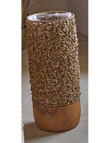 Jarrón-paragüero trenzado madera, fusiona lo artesanal y lo funcional en una pieza con estructura de varillas metálicas forrada en cuerda trenzada de acabado cálido. Su base de madera de paulownia aporta estabilidad y un aspecto natural que lo convierte en un complemento decorativo además de práctico. Gracias a su forro interior plástico puede utilizarse como paragüero en la entrada o como jarrón decorativo para ramas secas y flores artificiales. Ideal para sumar textura y un aire rústico a recibidores, salones o terrazas cubiertas.