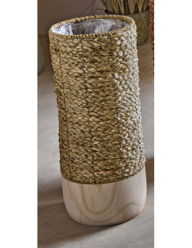 Jarrón-paragüero cuerda natural madera, destaca por su acabado en cuerda de fibras naturales trenzadas sobre una estructura de varillas metálicas que le confiere resistencia y estilo. La base en madera de paulownia aporta un contraste cálido que lo hace atractivo tanto como accesorio funcional en entradas, como paragüero, o como pieza decorativa en salones y dormitorios. Su interior forrado en plástico lo hace versátil y seguro para contener objetos, ramas o cañas decorativas. Una opción perfecta para quienes buscan añadir un toque natural y acogedor a su hogar.