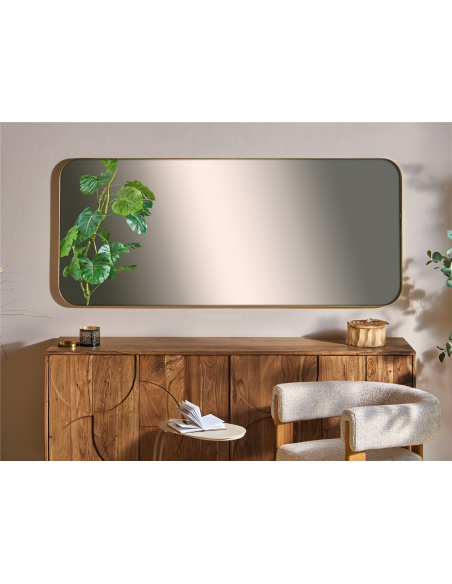 Espejo esquinas redondeadas oro 175 cm, un diseño de líneas limpias con estructura metálica en acabado dorado que destaca por su forma rectangular y esquinas suavemente curvadas. Puede colocarse tanto en vertical como en horizontal, adaptándose a diferentes espacios y necesidades decorativas. Ideal para pasillos, recibidores o dormitorios, donde aporta amplitud y luminosidad, convirtiéndose en un elemento funcional y sofisticado.