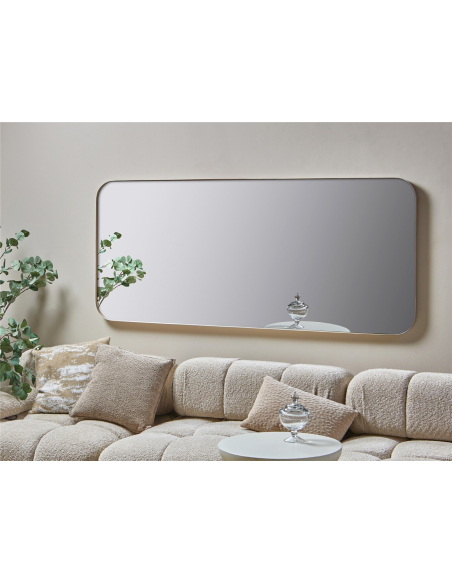 Espejo esquinas redondeadas beige 175 cm, un espejo rectangular con marco metálico en acabado beige, pensado para aportar ligereza y suavidad visual gracias a sus esquinas redondeadas. Puede colgarse en vertical u horizontal, ofreciendo múltiples posibilidades de uso según la estancia. Su diseño alargado y contemporáneo lo convierte en una pieza clave para aportar amplitud y luminosidad, siendo perfecto para salones, pasillos o dormitorios de estilo moderno y natural.