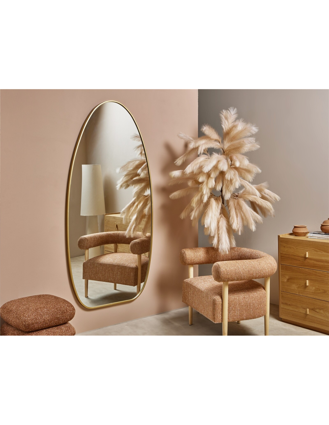 Espejo oval oro 180 cm, con su silueta ovalada y acabado en oro, combina sencillez y sofisticación. Su formato vertical lo convierte en una pieza ideal para vestidores, dormitorios o pasillos, aportando sensación de amplitud y reflejando la luz natural de manera armónica. El marco metálico aporta resistencia y un toque moderno que encaja en estilos diversos.