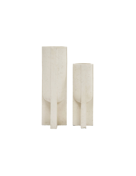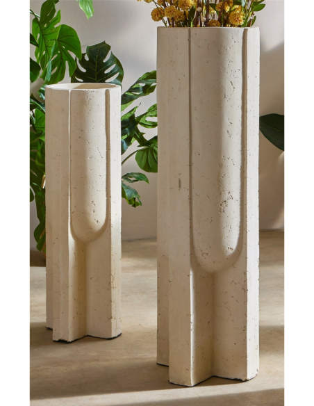 Set 2 vasijas símil piedra base cruz 101 cm, estas vasijas altas presentan un original diseño con base en cruz que aporta estabilidad y una estética contemporánea. Acabadas en blanco con textura símil piedra, evocan la serenidad de los materiales naturales y se convierten en piezas versátiles para distintos estilos decorativos. Perfectas para realzar rincones con arreglos florales, ramas secas o incluso solas como esculturas decorativas. Fabricadas en fibrocemento, aseguran durabilidad y resistencia, adaptándose tanto a espacios interiores elegantes como a zonas exteriores donde aportan luz y pureza al ambiente.